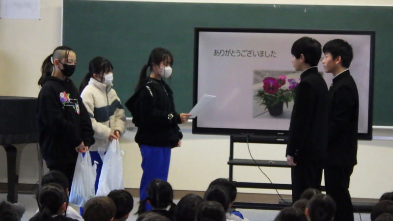 本校卒業生で竜東中の造園委員会の生徒2名からパンジーの苗をいただきました。竜東中が長年花壇づくりの活動に取り組んでいることや、パンジーの育て方のコツについてお話していただきました。説明をするお兄さんたちの姿から、かっこいいなぁ、すごいなぁと憧れる様子もありました。これから迎える卒業式や入学式といったお祝いの式で、きれいに飾れるよう栽培していきたいと思います。