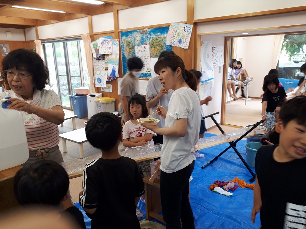 龍江小学校は夏休み中のお楽しみですが、多くの児童は日中は学校に隣接する児童クラブにお世話になっています。8月9日には学校職員もご招待いただき、夏の年中行事である流しそうめんが行われました。ペットボトルを切り開いて作った水路にそうめんやおかずが流れてくると、みんなではしゃぎながらすくって食べました。子どもたちはみんな元気そうでした。