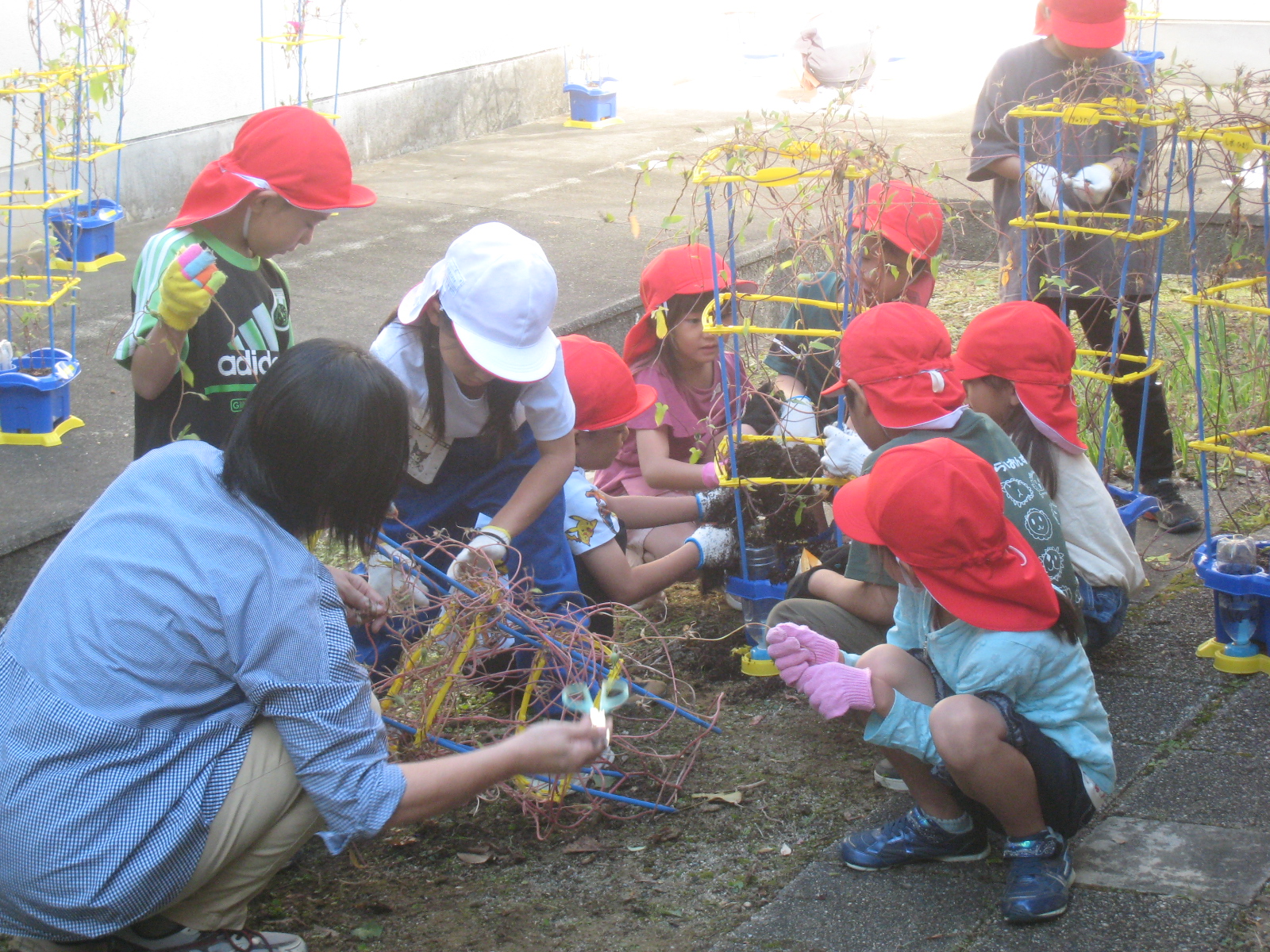 大切に育ててきた朝顔さんのつるをとりました。たくさん絡み合ってなかなかほどくことができませんでしたが、できるだけちぎれないように扱う子どもたちでした。途中、「一日に10こも花が咲いたんだよ」「全部で100こ花が咲いたよ」などと、たくさん花を咲かせてくれた朝顔さんのことを思い出す姿もありました。