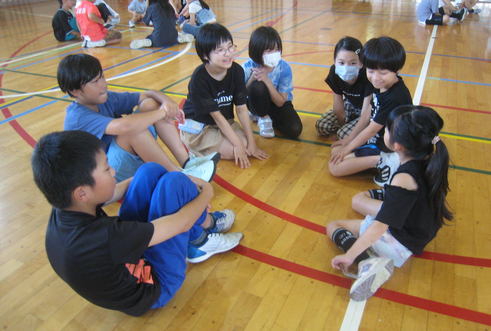 6年生の皆さんが、自己紹介ゲームを計画してくれました。縦割り班ごとに集まって、「好きな〇〇」というお題を決めて発表するのですが、その際、自分の前のお友達が発表したことを復唱するところがこのゲームのミソです。発表することを考えたり、なんて話してくれるのか身を乗り出したり、さまざまな姿が見られました。